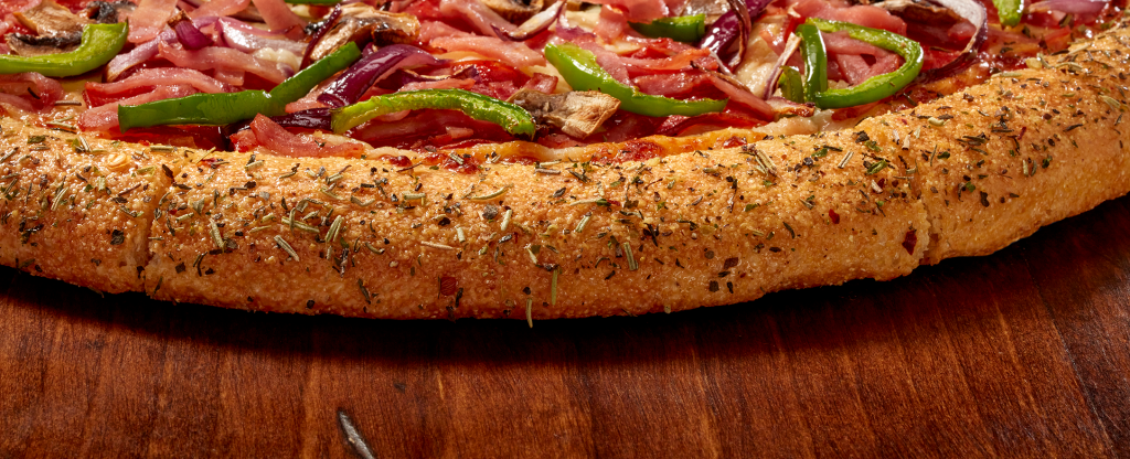 Italian Herb Flavored Crust is a golden-baked crust brushed with a blend of basil, rosemary, oregano, garlic, and parsley, creating a fragrant, savory crust that goes well with any pizza.