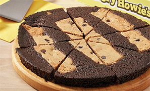 Family-size, oven-baked fudge brownie with lavers of chocolate chip cookie